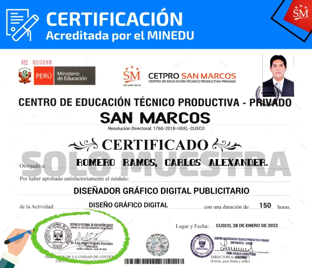 El Centro de Educación Técnico Productiva Privado «San Marcos» (CETPRO SAN MARCOS), otorga al terminar CERTIFICADO A NOMBRE DEL MINISTERIO DE EDUCACIÓN, luego de haber aprobado:
